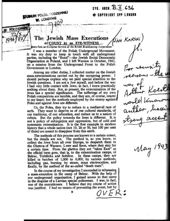 «Свидетельство очевидца о массовом уничтожении евреев», написанное Яном Карским по-английски и прочитанное в мае 1943 г. по радио ВВС.