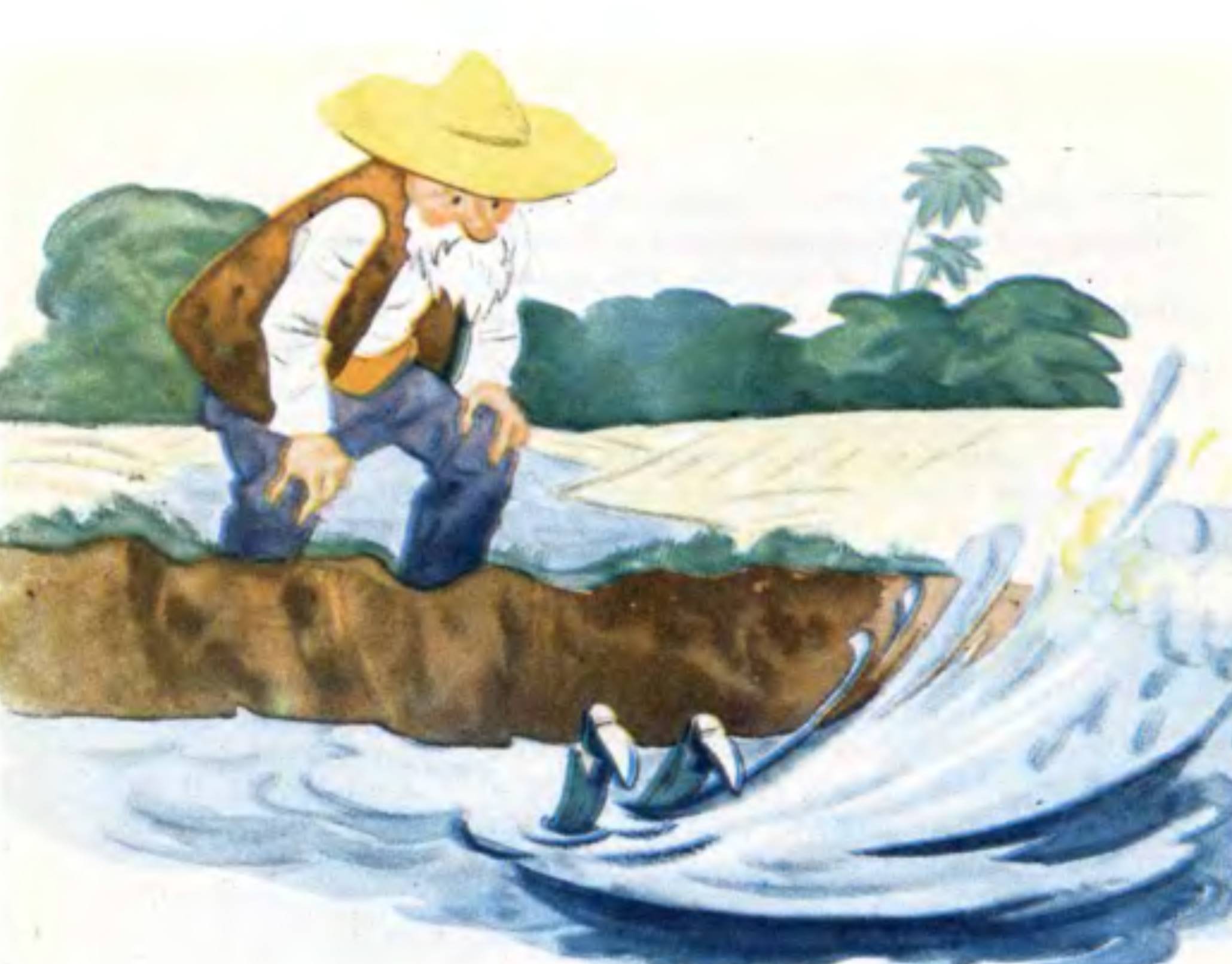 Крестьянин пошел дальше по поселку, но не решился постучать ни в одну хижину. Он знал, что его там ждет такой же ответ. А тем временем разрушается плотина... И в этот момент он увидел рыбака, который, неся на плечах сети, шел к морю.