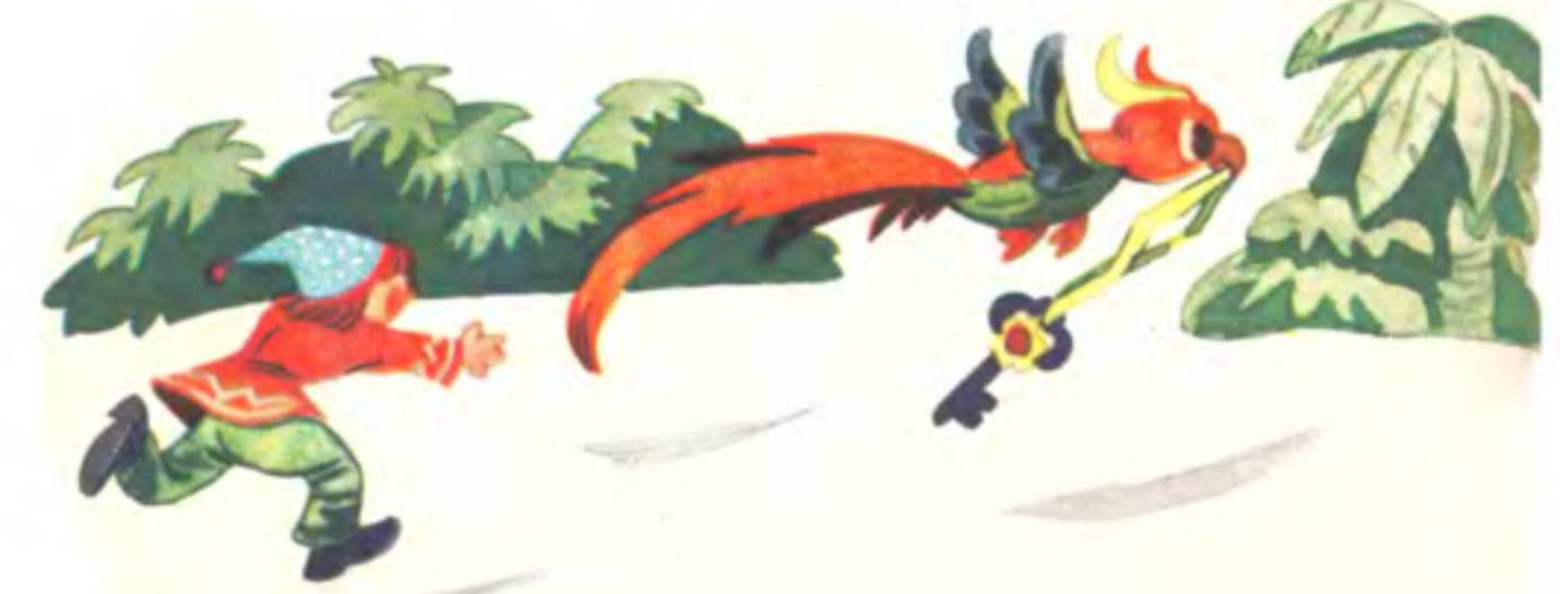 Петрушка мчался за попугаем, а тот летел высоко над дорогой небольшим пестрым комочком. Видимо, ключ все- таки был тяжел для этой птицы, поэтому он летел не так