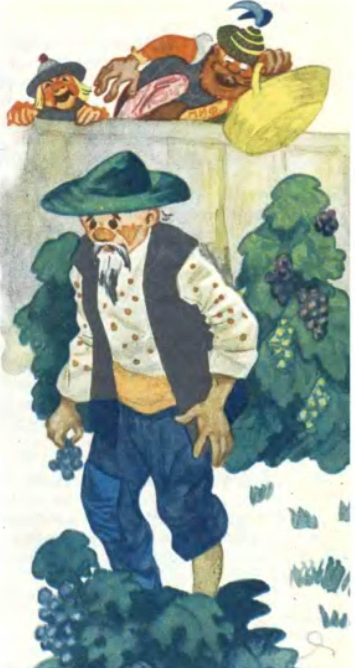 Лови-Хватай и стражники набрали по большой корзине и хотели уже уходить, оглянулись, а Начинай-Незаканчивай все лежит, не шевелится.