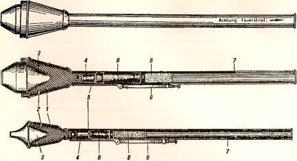 Рис. 28. Динамо-реактивные противотанковые приспособления (общий вид и разрез): сверху — «Panzerfaust 1»; снизу — «Panzerfaust 2». 1 — корпус мины (гранаты); 2 — разрывной заряд; 3 — кумулятивная воронка; 4 — детонирующее устройство; 5 — реактивный (вышибной) заряд; 9 — ударный механизм.