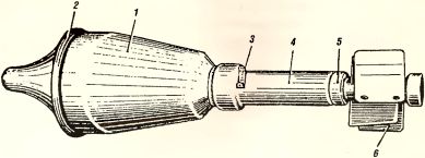 Рис. 29. Мина (граната) к РПГ «Panzerfaust 1». 1 — корпус мины (гранаты); 2 — ободок; 3 — ушко мины; 4 — металлический стакан; 5 — деревянный стержень; 6 — хвостовое оперение.