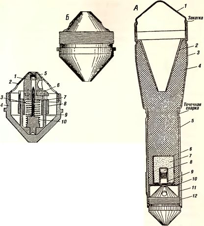 Рис. 39. Большая ружейная бронебойная граната обр. 1943 г. и взрыватель к ней в разрезе: А — разрез гранаты: 1 — баллистический колпак (наконечник); 2 — кумулятивная воронка; 3 — корпус; 4 — разрывной заряд (ВВ); 5 — стебель с нарезай (ведущими выступами); 6 — оболочка детонатора; 7 — детонатор; 8 — капсюль-детонатор; 9 — гильза капсюля; 10 — картонное кольцо; 11 — колпачок; 12 — взрыватель. Б — общий вид и разрез взрывателя: 1 — втулка; 2 — крышка взрывателя; 3 — чека; 4 — корпус взрывателя; 5 — капсюль-воспламенитель; 6 — зуб втулки; 7 — жало; 8 — инерционное кольцо; 9 — ударник; 10 — контрпредохранительная пружина.