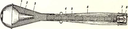 Рис. 41. Разрез ручной противотанковой гранаты кумулятивного действия. 1 — корпус; 2 — кумулятивная воронка; 3 — разрывной заряд; 4 — деревянная рукоятка; 5 — детонатор; 6-матерчатые ленты стабилизатора; 7 — металлический колпачок; 8 — взрыватель.