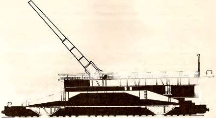 Лафет орудия покоился на специальной платформе, занимающей сразу две параллельных колеи железной дороги (восемь пятиосных тележек). Боевая масса установки составила 1350 тонн. Максимальный угол возвышения ствола достиг 65 градусов. Огонь мог вестись только строго параллельно железнодорожному пути, на котором стояло орудие — любое отклонение от этой оси под воздействием страшной силы отката грозило перевернуть махину набок. Кроме того, масса установки, приближавшаяся к критической, не позволила ввести в конструкцию лафета тяжеловесные устройства горизонтальной наводки. Наведение в горизонтальной плоскости осуществлялось с помощью выкладывания на нужном курсовом угле ветки железной дороги, на которую и загонялся состав с орудием.