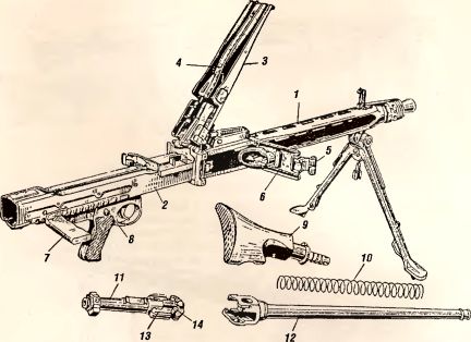 Рис. 22. Части пулемета MG 42: 1 — кожух; 2 — короб; 3 — крышка короба; 4 — рычаг подачи; 5 — защелка дверцы кожуха; 6 — дверца кожуха; 7 — рукоятка заряжения; 8 — предохранитель; 9 — затыльник с прикладом; 10 — возвратно-боевая пружина; 11 — остов затвора; 12 — ствол со ствольной коробкой; 13 — боевая личинка; 14 — запирающие ролики.