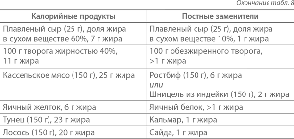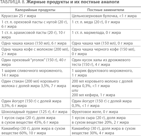 Жирные продукты поставляют большинство калорий нашему организму. В рамках рациона с пониженным объемом калорий следует заменять калорийные продукты на более постные.