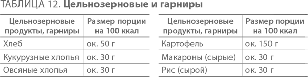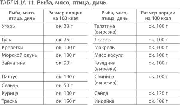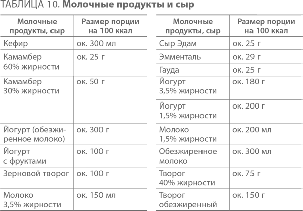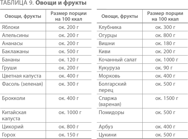 В приведенных ниже таблицах вы найдете список продуктов питания с порциями, содержащими 100 ккал.
