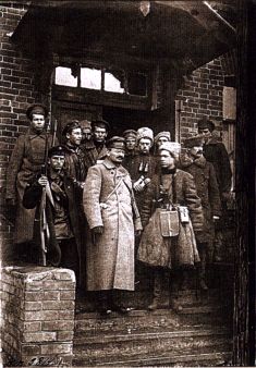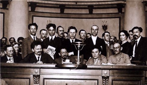 Президиум II съезда Советов Союза коммун Северной области. В группе — Троцкий, Зиновьев, Лашевич, Стасова, Крестинский, Зорин, Свердлов. г. Петроград 1918 г.