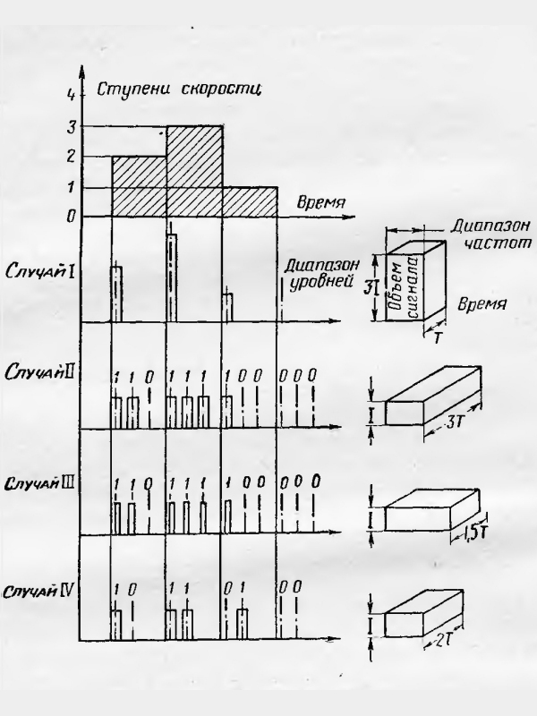 Предположим, что с помощью автоматического устройства мы передаем на пульт управления информацию о скорости обработки каких-то деталей. В зависимости от характера операций скорость станка меняется много раз. Но изменения эти происходят не плавно, а так же, как и в автомашине, то есть тремя ступенями: 1-я, 2-я и 3-я. Если учесть к тому же, что в некоторые моменты времени может понадобиться остановка станка, то вся информация о его «поведении» может быть сведена к передаче четырех различных значений скорости: 0, 1, 2 и 3.