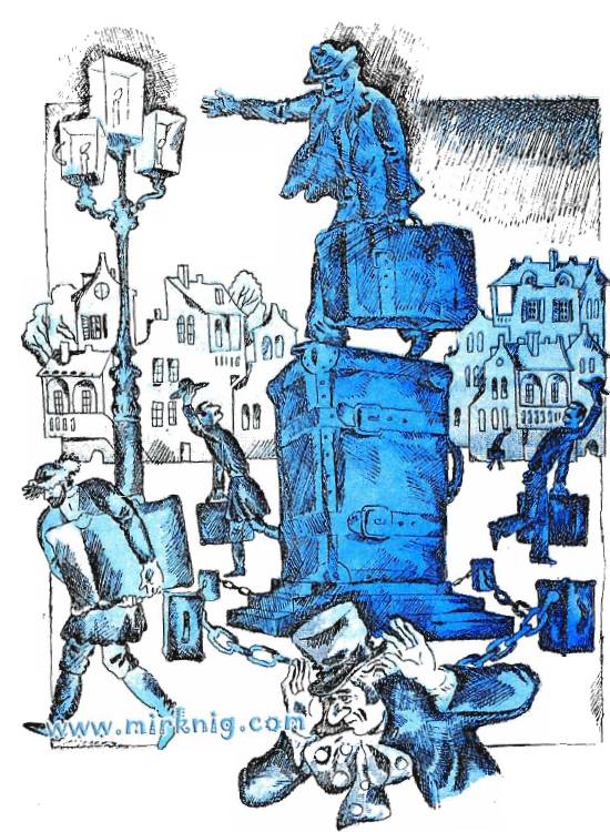 И лишь один человек во всём городе не имел чемодана. Он грустно бродил по улицам, подняв воротник пальто и засунув руки в карманы.