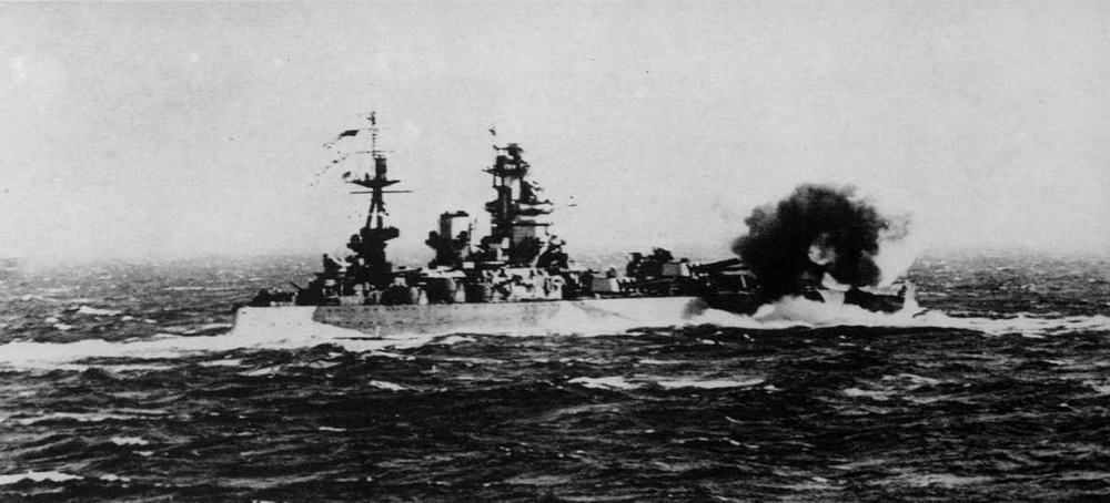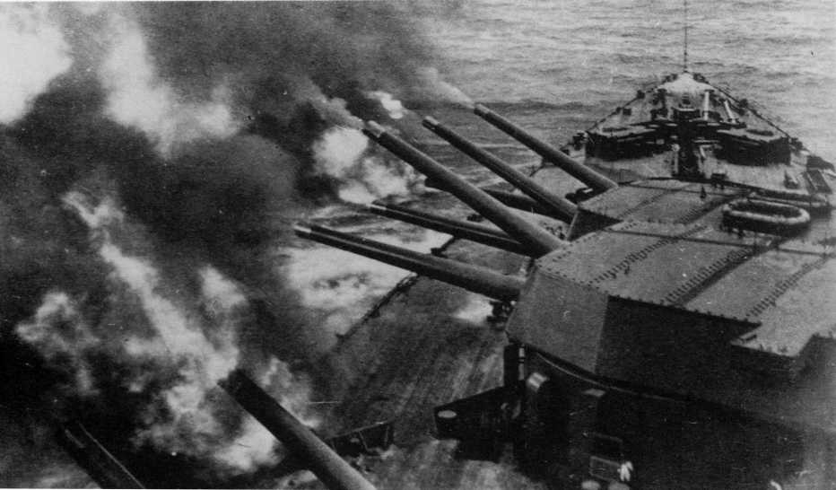 Линейный корабль “Нельсон”. Залп из орудий главного калибра (фото вверху).