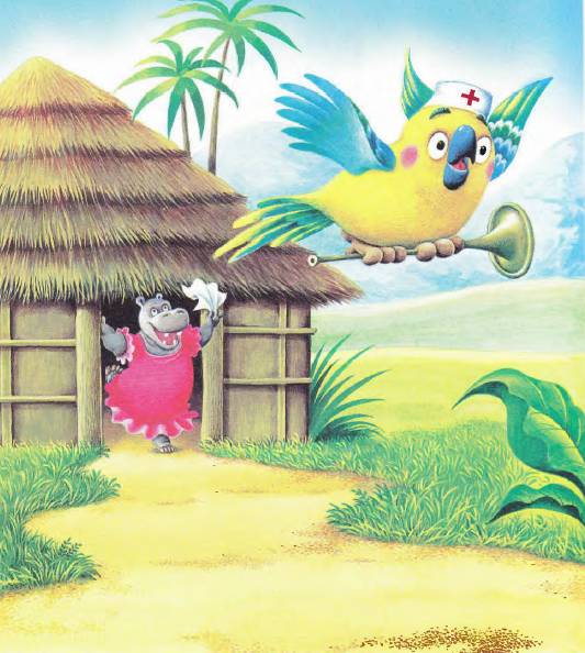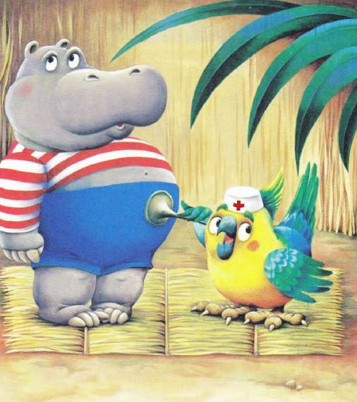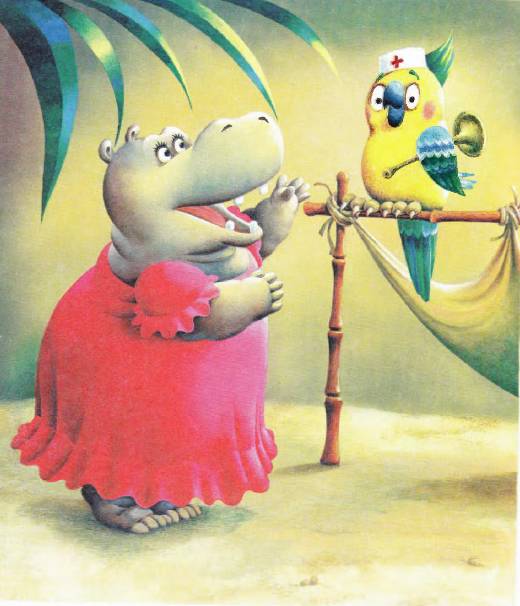 Ах! в отчаянии воскликнула мама Бегемотиха. — Доктор Попугай, пожалуйста, спасите моего сыночка.