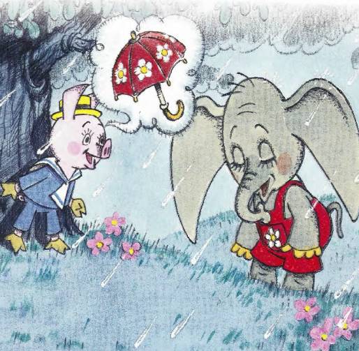 Слышит, идет кто-то по дороге, большой. Топает шлепает, дождя не боится. И песню поёт. А это -Слоненок, вот кто. Посмотрел на большие слоновьи уши Поросенок и показалось ему, что похож он на зонтик!