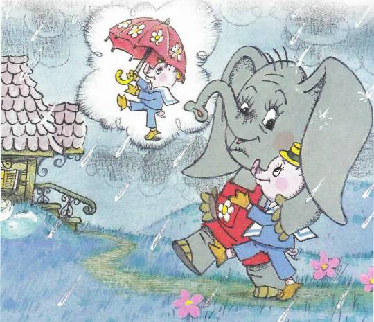 – Спрячь меня от дождя. Тогда мы в гости пойдём, -обрадовался Поросёнок и залез под слоновье ухо, выставив оттуда нос-пятачок.