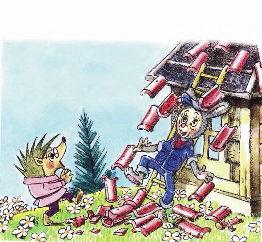 – Чинить крышу - моё любимое занятие, - хвастливо заявил Заяц и принялся за работу.