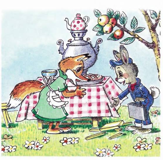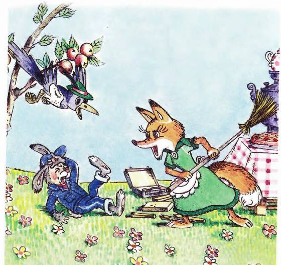 – и сломалась! Упал Заяц да ещё чашку с чаем опрокинул на Лису. Рассердилась она и прогнала незадачливого «мастера» метлой.