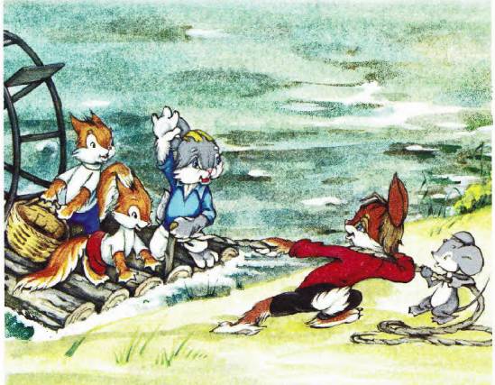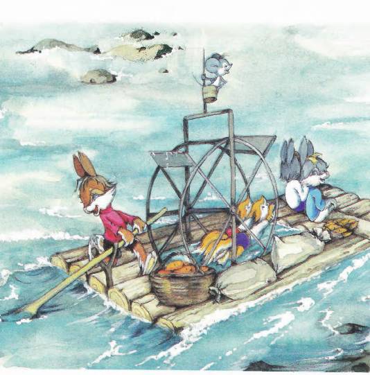 А зайцы и белки тем временем на плоту по реке плывут. Белки на колесе по перекладинкам скачут, лопасти вращают. Ходко плывёт заячий кораблик с морковным грузом на борту.