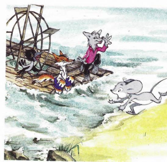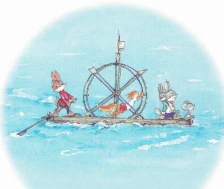 А зайцы и белки тем временем на плоту по реке плывут. Белки на колесе по перекладинкам скачут, лопасти вращают. Ходко плывёт заячий кораблик с морковным грузом на борту.