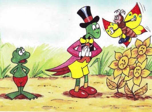 На берегу он попросил Кузнечика показать цветочный ЛУГ- Друзья поднялись на луг. Цветы стояли поникшие и тихо плакали.