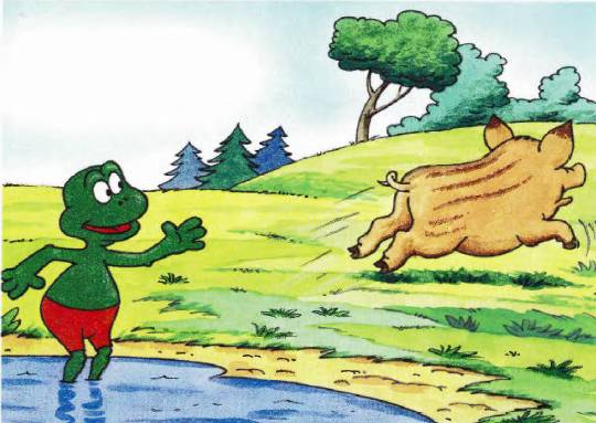 Он скрылся за кустами и, разогнавшись, прыгнул на середину лужи, к самой морде Кабанчика, и проквакал страшным голосом: