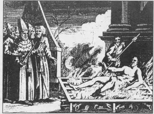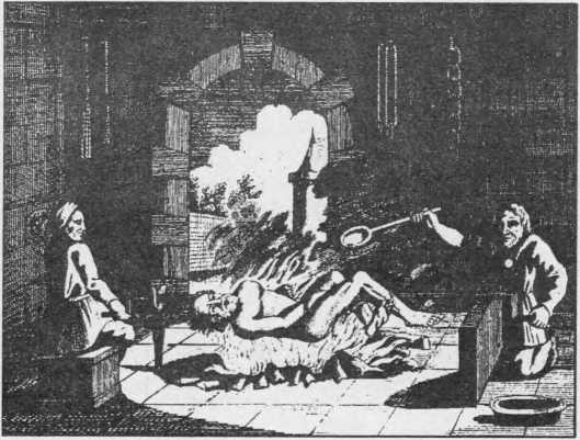 Другой метод пытки — зажаривание живьем на вертеле, к которому прибегали гонители ранних христиан, поливавшие кроме того половые органы жертвы уксусом и посыпавшие их солью, как это описано в «Книге мучеников» (Book of Martyrs) Фокса [29] .