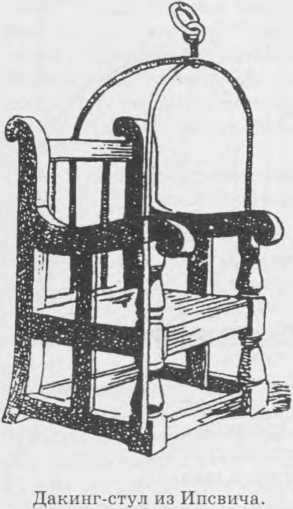 Дакинг-стул — особое приспособление, используемое в Англии для наказания сварливых женщин. Веселые выдумщики англичане привязывают нечто вроде кресла на конце двух расположенных параллельно брусов, длиной примерно 12–15 футов. Кресло закреплено свободно, и когда брусы устанавливаются центрами на поперечине, оно сохраняет горизонтальное положение при любом наклоне брусов. Все это сооружение помещают как можно ближе к реке, поднимают как можно выше восседавшую в кресле женщину и окунают ее в холодную воду. Количество погружений зависит от длины ее языка и темперамента. Как правило, после нескольких таких погружений успокаиваются самые несдержанные на язык жены.