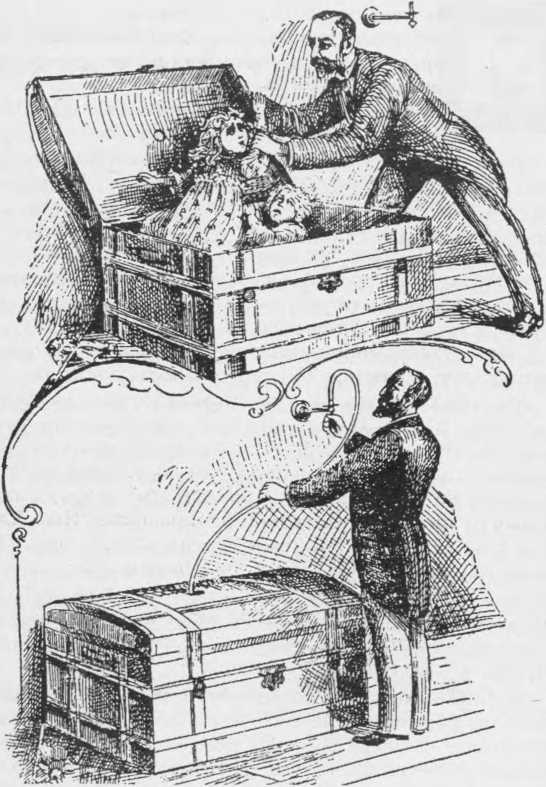 Сцены из преступной жизни Германна Маджета. Вверху: дети умоляют Маджета о пощаде. Внизу: Маджет просовывает газовую трубку в отверстие в сундуке, куда помещена жертва.