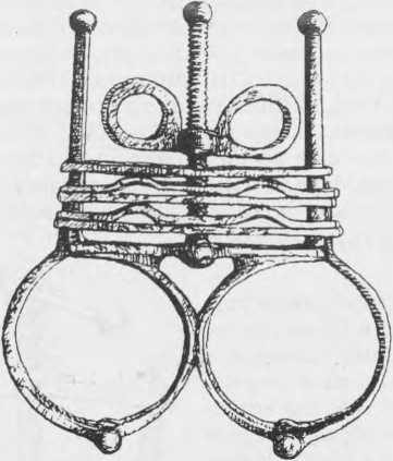 Это было устройство, с помощью которого узнику сдавливали конечности. Сначала преступника раскладывали на полу камеры, зажимали ступню правой ноги между двумя металлическими болванками, по форме напоминавшими игральные кости, но с углублениями на одной стороне. Затем с помощью веревки и рычага сжимали болванки и тем самым дробили кости узника.