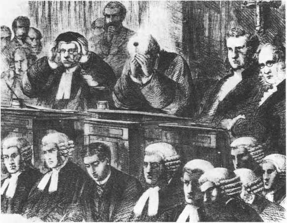 Мистер Бэрон Мартин надевает на голову «черную шапку», объявляя смертный приговор Францу Мюллеру, впервые совершившему убийство в поезде