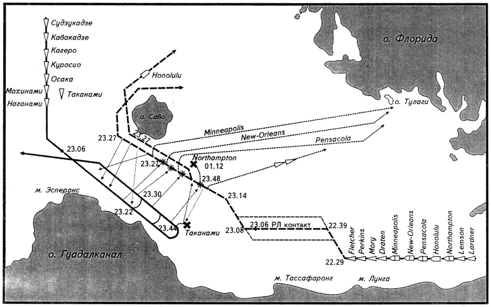 Причинами такого позорного поражения стали неудачно проведенная американскими эсминцами в начале боя торпедная атака (из 74 торпедных аппаратов было выпущено лишь 20 торпед), запаздывание с подъемом гидросамолетов-осветителей, слишком запоздалое выполнение противоторпедного маневра. Вообще, бои у Гуадалканала продемонстрировали превосходство японских моряков в навыках ведения ночного боя.