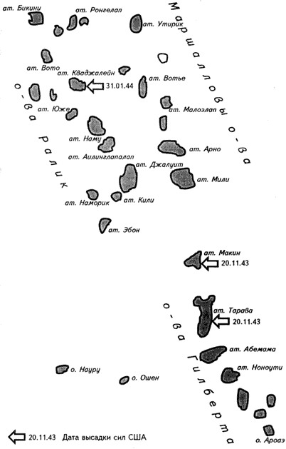 По американским планам высадка десантов на островах Тарава и Макин в группе островов Гилберта намечалась на 20 ноября 1943 г. Начиная с 13 ноября авиация берегового базирования с Фунафути и других близлежащих баз начала проводить активные дневные и ночные атаки против всех японских позиций на островах Гилберта. Захват о. Тарава был предпринят ввиду необходимости иметь базу для авиации берегового базирования в пределах досягаемости от Маршалловых островов, нашего первого крупного объекта. Это была необходимая предпосылка для последующих крупных операций.