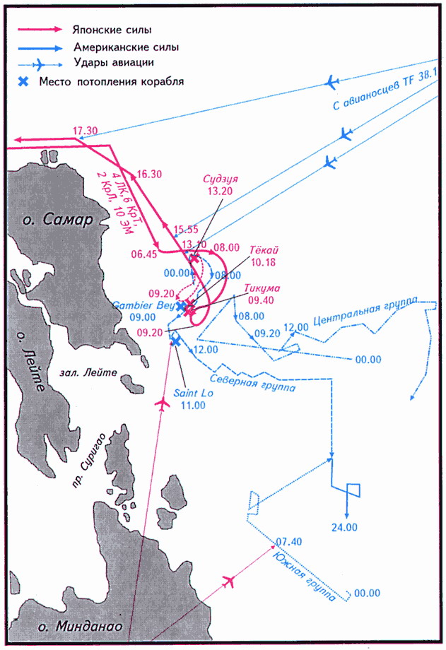 Однако, когда Холси получил от Кинкейда отчаянную просьбу о помощи его авианосцам у о. Самар, Маккейну было приказано идти туда самым полным ходом и выслать ударные авиагруппы в атаку против центральных сил Куриты, как только он окажется в радиусе действия самолетов. Эти ударные авиагруппы появились над своими целями в 13.10 и 15.00. Обе группы причинили японцам дополнительные повреждения, но ни одной из них не удалось потопить ни одного корабля [172] .