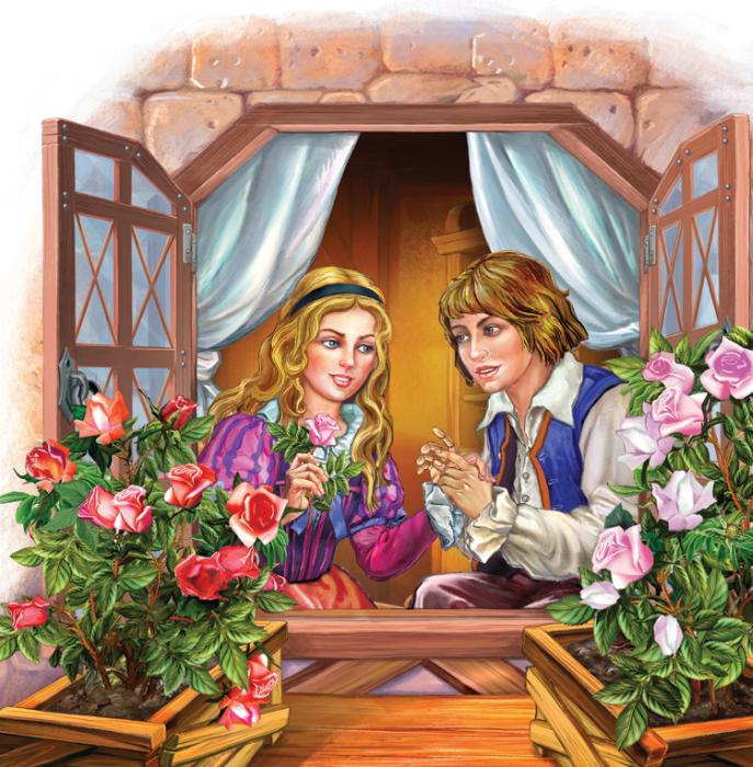 Цветущие розовые кусты заглядывали с крыши в открытое окошко; тут же стояли их детские стульчики. Кай с Гердой сели каждый на свой, взяли друг друга за руки, и холодное, пустынное великолепие чертогов Снежной королевы забылось, как тяжёлый сон.