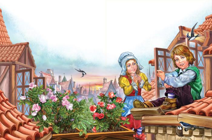 У родителей было по большому деревянному ящику, в них росла зелень для приправ и небольшие розовые кусты – по одному в каждом ящике, пышно разросшиеся. Родителям пришло в голову поставить эти ящики поперёк жёлоба, так что от одного окна к другому тянулись словно две цветочные грядки. Зелёными гирляндами спускался из ящиков горох, розовые кусты заглядывали в окна и сплетались ветвями. Родители позволяли мальчику и девочке ходить друг к другу в гости по крыше и сидеть на скамеечке под розами. Как чудесно им тут игралось!
