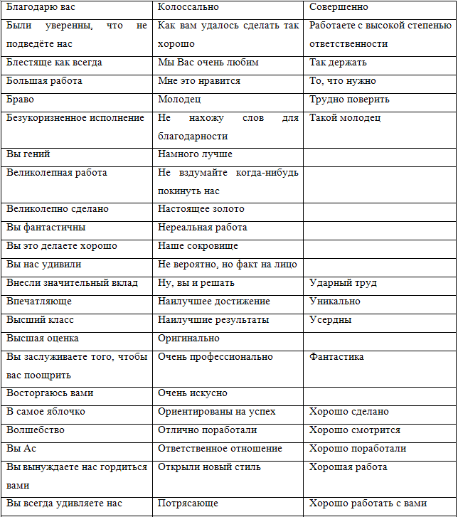 Таблица 3.1. Варианты благодарностей и похвалы за хорошую работу