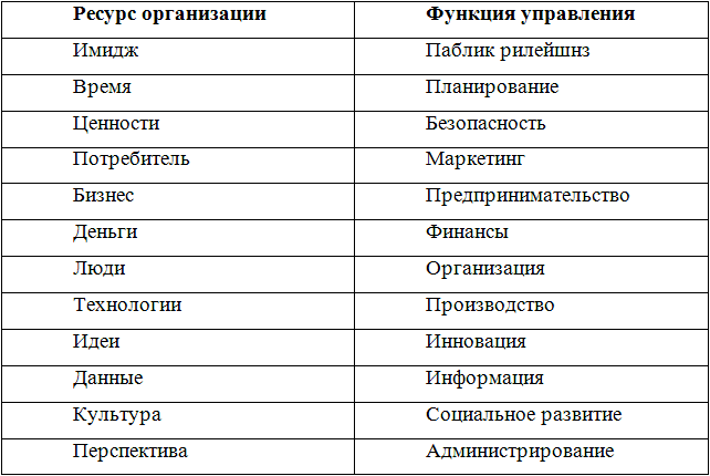 Распространенным является определение функций управления соответственно основным ресурсам, используемым организацией в своей деятельности (таблица 10.1.).