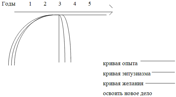 После принятия новой должности работник приобретает опыт. С увеличением опыта у него увеличиваются потенциал энтузиазма и желание освоить новое дело, однако энтузиазм и эффективность возрастают и достигают апогея на 2 – 3-м году работы, позже начинается постепенный спад. После 4 лет спад становится невосполнимым, поэтому работника необходимо переводить на другую должность по вертикали или по горизонтали. Если таковой возможности не имеется или фирма больше не нуждается в сотрудничестве, то такому работнику дают возможность уволиться.