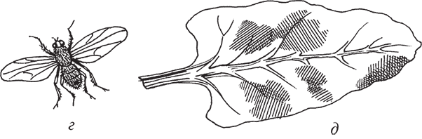Рис. 86. Свекловичная муха (окончание): г – взрослая свекловичная муха; д – лист свеклы, поврежденный личинками