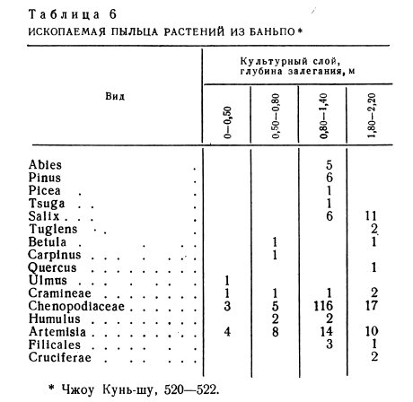В значительной мере иная картина предстает перед нами в результате анализа пыльцы растений, взятой из неолитического поселения близ Баньпо (Шэньси). В 1962 г. на территории этого поселения было взято 28 проб, соответствующих 7 последовательным слоям; пыльца была обнаружена в четырех из них (табл. 6).