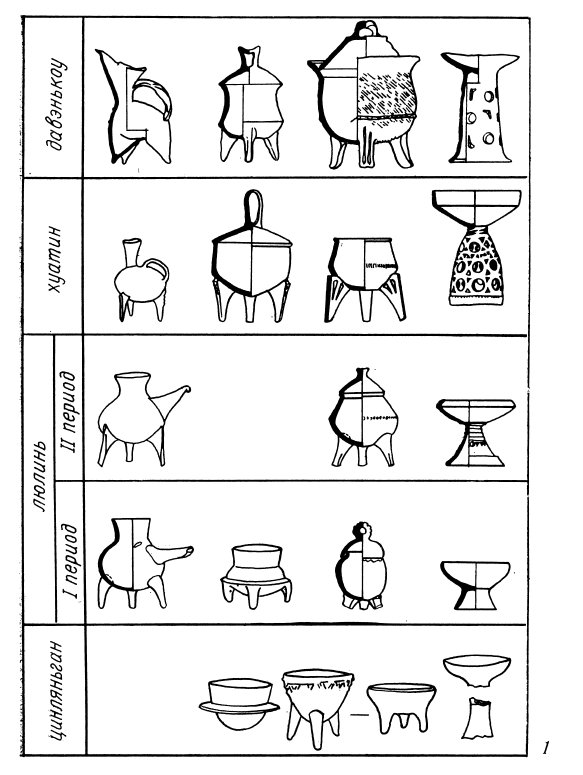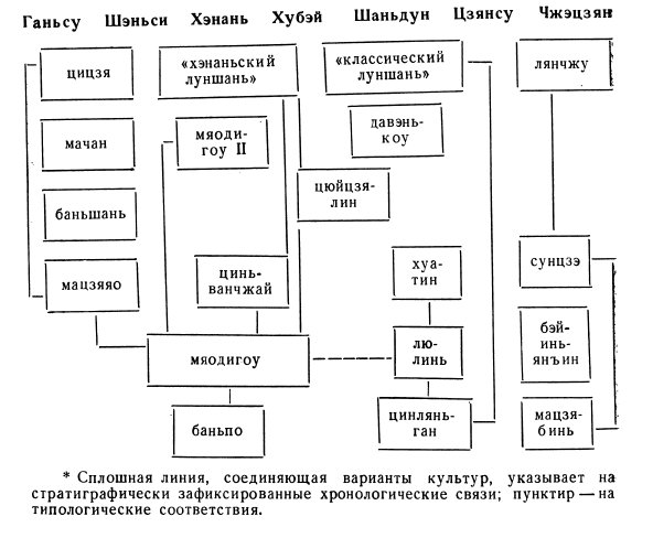 Яншао — цинляньган. В 1963 г. при раскопках Дадунь-цзы (Цзянсу, уезд Пэйсянь) в нескольких погребениях периода люлинь были обнаружены типично яншаоские сосуды (типа мяодигоу), которые, по всей вероятности, следует рассматривать как привозные вещи [Цзянсу пэйсянь дадуньцзы…, 21–36]. Эти находки позволяют синхронизировать варианты мяодигоу и люлинь.