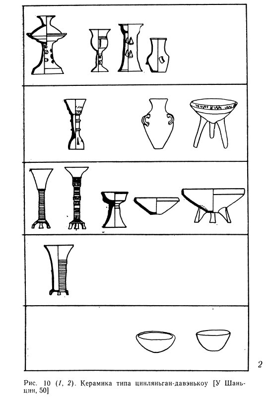 Немаловажное значение для понимания истории культур неолита в восточной зоне имело также установление генетической связи поздних слоев культуры цинляньган с памятниками типа давэнькоу (33), открытыми на территории провинции Шаньдун — в уезде Нинъян, а также близ г. Цюйфу [Ян Цзы-фань; Чжао И-цин; Шаньдун цюйфу сисяхоу…] (рис. 10).. В Давэнькоу прослеживаются уже отдельные черты культуры черной керамики луншань. Таким образом, истоки луншаня в его классической форме следует искать, по-видимому, не в Шаньдуне, а южнее, на территории Цзянсу.