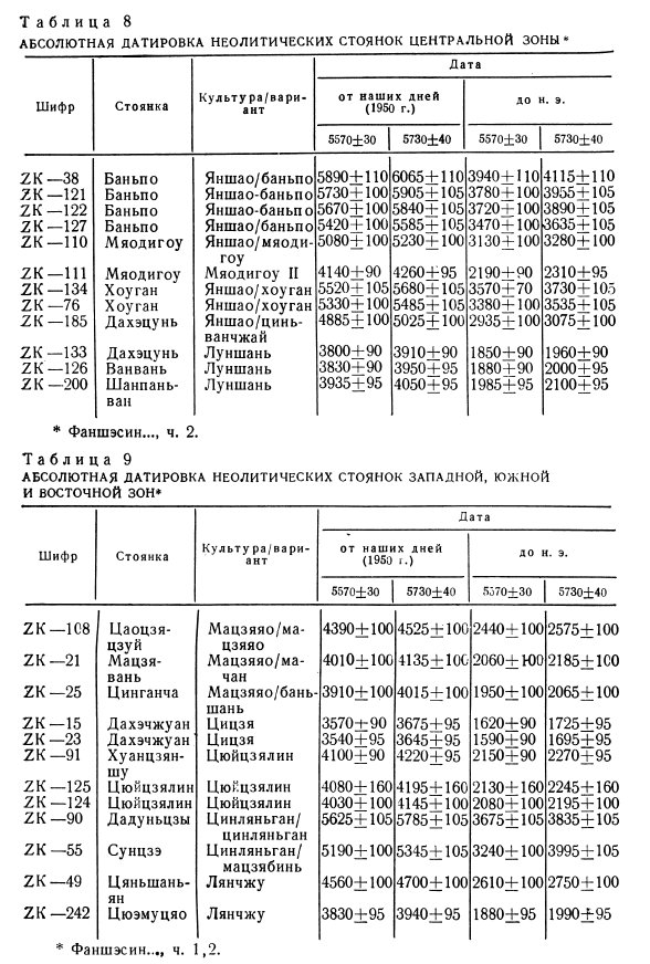 Необходимо иметь в виду, что при исчислении абсолютных дат сотрудники пекинской лаборатории первоначально пользовались не «значением Либби» (период полураспада С 14, равный 5570 ± 30 лет), а уточненным значением, предложенным Г. Годвином (5730 + 40 лет). Последнее значение признается сейчас более вероятным, однако, как известно, Кембриджский международный симпозиум 1962 г. рекомендовал по-прежнему пользоваться «значением Либби» в целях унификации всех опубликованных дат [Проблемы…, 8]. Далее абсолютный возраст эталонов (годы от наших дней) отсчитывался не от 1950 г., как принято в международной практике, а от 1965 г. Все это делает необходимым произвести пересчет опубликованных цифр, с тем чтобы сделать их сопоставимыми с корпусом абсолютных датировок, уже вошедших в научный оборот (такой пересчет был выполнен Чжан Гуан-чжи [Chang К. G., 1973, 526]. Третья публикация абсолютных дат, предпринятая пекинской лабораторией, была выполнена с соблюдением этого требования.