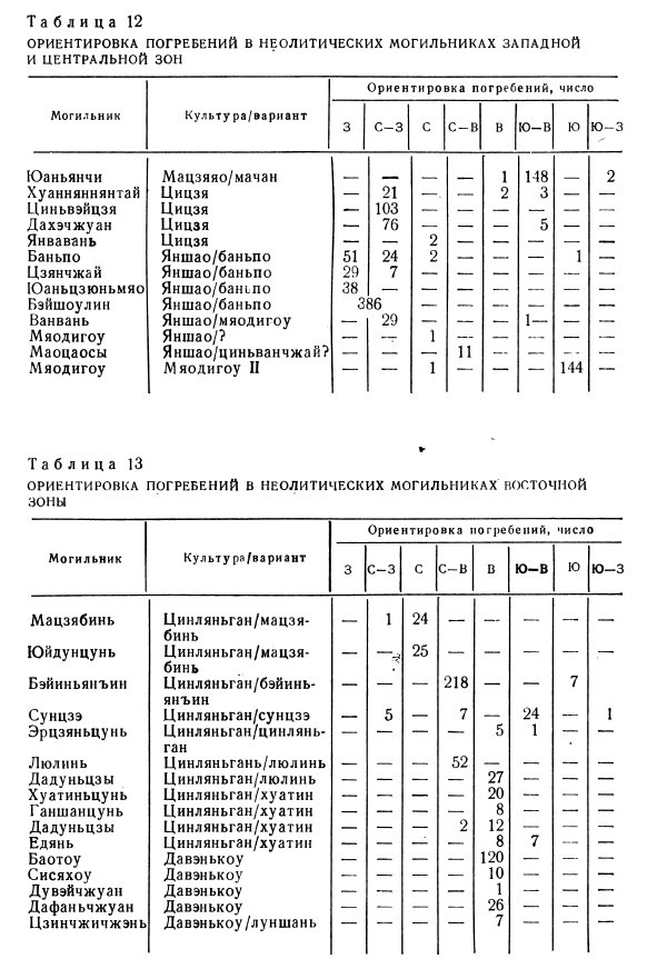 Данные об ориентировке погребенных в могильниках различных культур эпохи неолита (табл. 12 и 13) дают основания для следующих предположений.