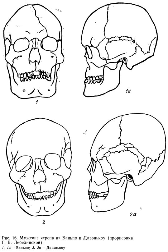 Помимо этих остатков в нашем распоряжении теперь имеются данные о краниологических сериях, обнаруженных в погребениях Давэнькоу и Сисяхоу, которые относятся к культуре давэнькоу (III тысячелетие до н. э.), развившейся на основе цинляньгана [Янь Инь, 1972; его же, 1973] (рис. 16).