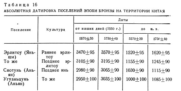 Все это привлекло значительное внимание к раскопкам в Эрлитоу, в более широких масштабах предпринятых после 1959 г. Они показали, что культурный слой в этом поселении представлен четырьмя горизонтами. В третьем из них, в центре поселения, обнаружено основание большого здания со следами колонн. Абсолютная датировка третьего горизонта — 1245 ± 90 г. до н. э. (с учетом поправочного коэффициента — 1300–1590 гг. до н. э.), первого горизонта — 1620±95 г. до н. э. (1690–2080 гг. до н. э.) [Хэнань яньши…, 234–248] (табл. 16).