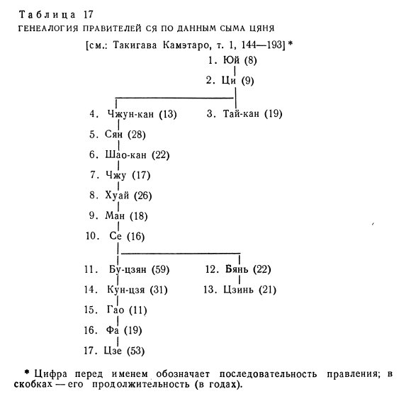 Будущие раскопки, несомненно, дадут новый материал для того, чтобы решить «проблему Ся». Но уже сейчас очевидно, что период Ся, изложение которого у Сыма Цяня по своему характеру весьма близко к Инь (и существенно отличается от эпохи «пяти императоров»), не может быть мифом. Достаточно вспомнить, что «Исторические записки» дают нам подробное генеалогическое древо правителей Ся (табл. 17), а аналогичные сведения об иньских правителях полностью подтвердили эпиграфические памятники.