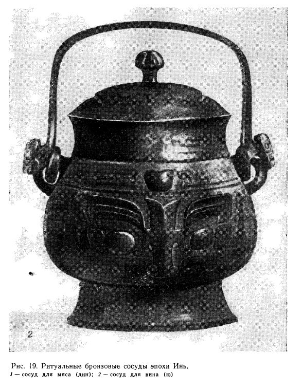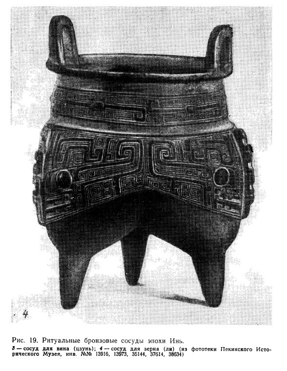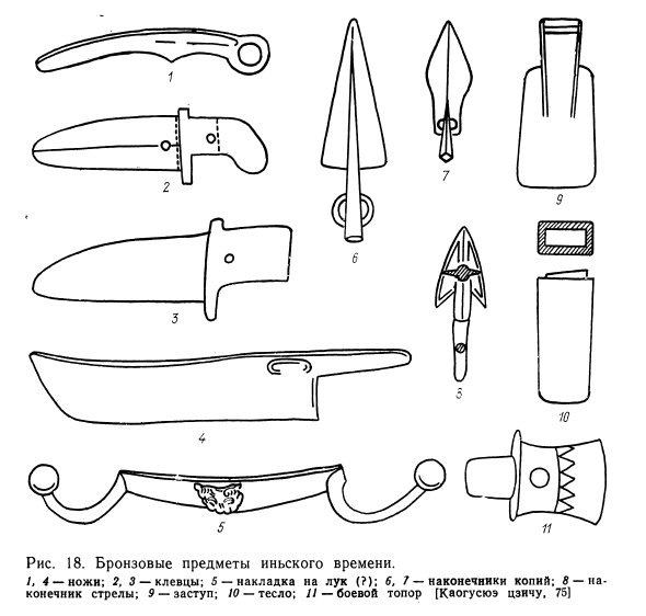 В области бронзолитейного производства — наиболее передовой отрасли ремесла и техники — в среднем Инь был достигнут значительный прогресс. Используя керамические формы, иньские мастера изготовляли не только оружие (клевцы, секиры, наконечники копий и стрел — рис. 18), но и ритуальные сосуды различного назначения и разнообразных форм. Многие из этих предметов украшались рельефным орнаментом [Чжэнчжоу ши мингунлу…, 501].