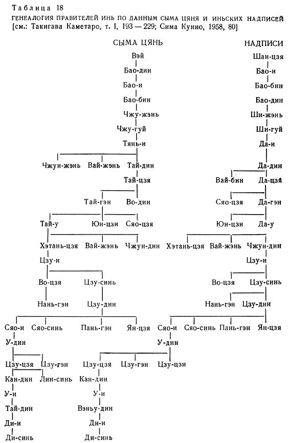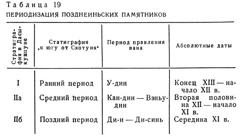 Важным достижением в деле изучения иньской культуры за последние годы явилась разработка периодизации археологических памятников позднего периода Инь. Стратиграфически в иньской столице можно выделить по крайней мере три периода, прослеживаемых в различных частях территории городища. Находки в этих слоях надписей, собственная периодизация которых была разработана еще в начале 30-х годов Дун Цзобинем, позволяет теперь соотнести каждый из трех периодов со временем правления одного или нескольких конкретных ванов. Наконец, контрольные датировки отдельных предметов методом радиокарбонного анализа дают возможность связать все эти данные на основе абсолютной хронологии (табл. 19).