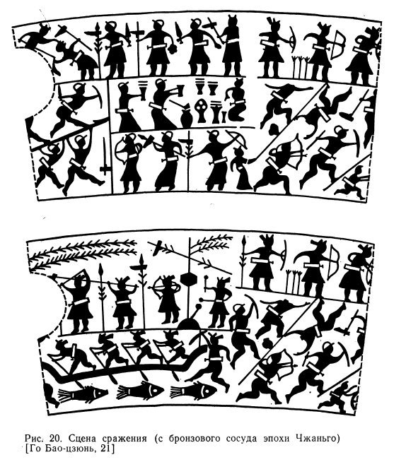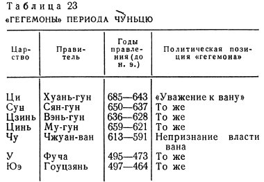 Развитие товарно-денежных отношений интенсифицирует культурные контакты между отдельными районами той территории, на которой в этот период существовали древнекитайские царства. Этому способствовала и общая ситуация во взаимоотношениях между ними. Если в VII–VI вв. до н. э. целью войн между царствами (рис. 20) было подчинение соседей и признание ими гегемонии одного правителя, то в период Чжаньго результатом военного поражения становилось, как правило, уничтожение побежденного царства и присоединение его территории к землям победителя. Конец Чуньцю и начало Чжаньго отмечены резким сокращением общего числа чжухоу и соответственно увеличением размеров царств, сохранивших свою независимость (табл.24) (карта 7).
